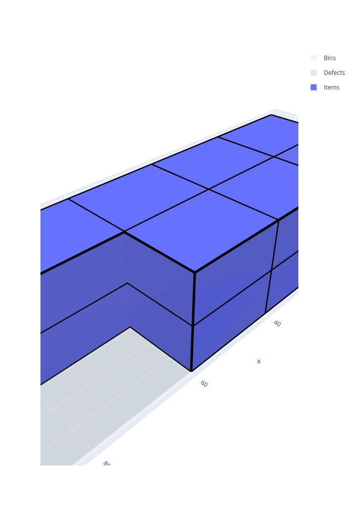 The Box solver solves three-dimensional bin packing problems where items are rectangular parallelepipeds (boxes) that must be packed into rectangular bins without overlapping. Unlike the BoxStacks solver, items are placed freely in 3D space — they are not restricted to vertical stacks and do not need to share a footprint.