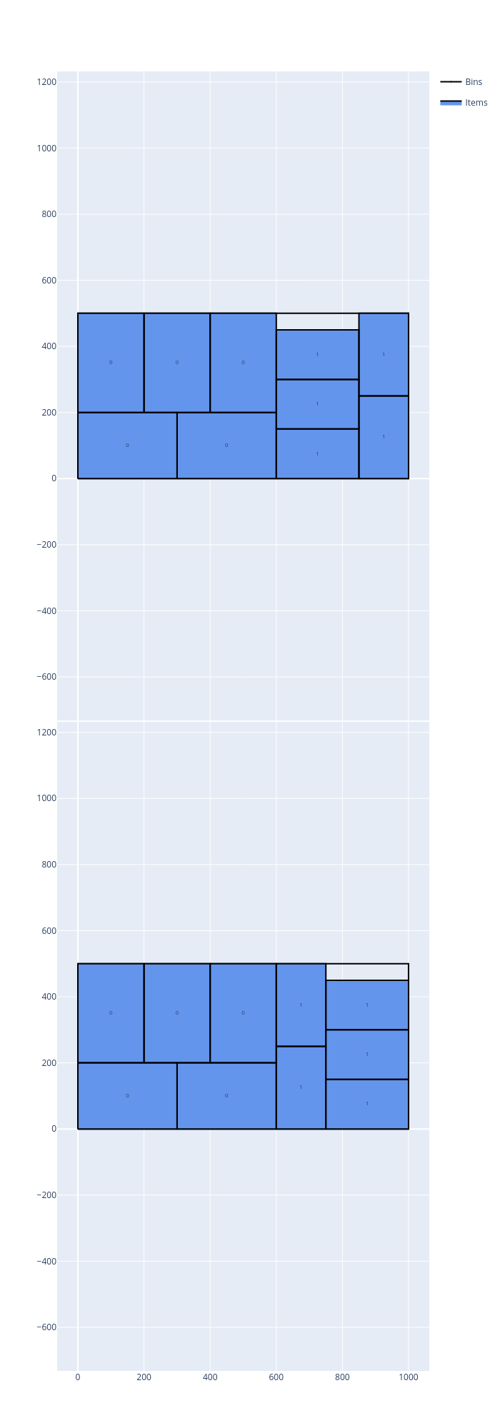 The Rectangle solver solves problems where items are two-dimensional rectangles that must be packed into rectangular bins without overlapping. Unlike the RectangleGuillotine solver, items can be placed in any position (guillotine cuts are not required).