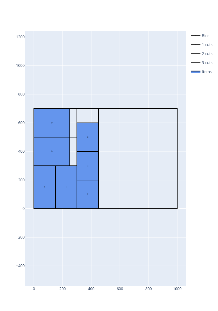 The RectangleGuillotine solver solves problems where items are two-dimensional rectangles that must be cut from rectangular bins using guillotine cuts — cuts that go all the way from one side of the current plate to the other.